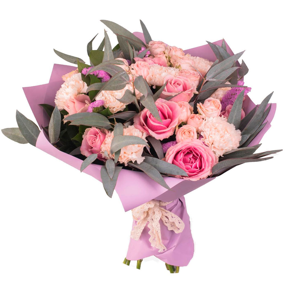 Роза одноголовая розовая, гвоздика, статица, зелень.