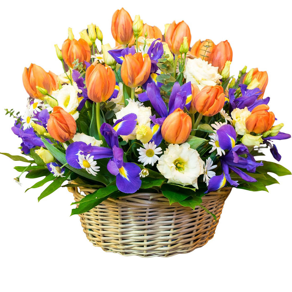 Тюльпан, ирис, ромашка кустовая, эустома, зелень.